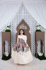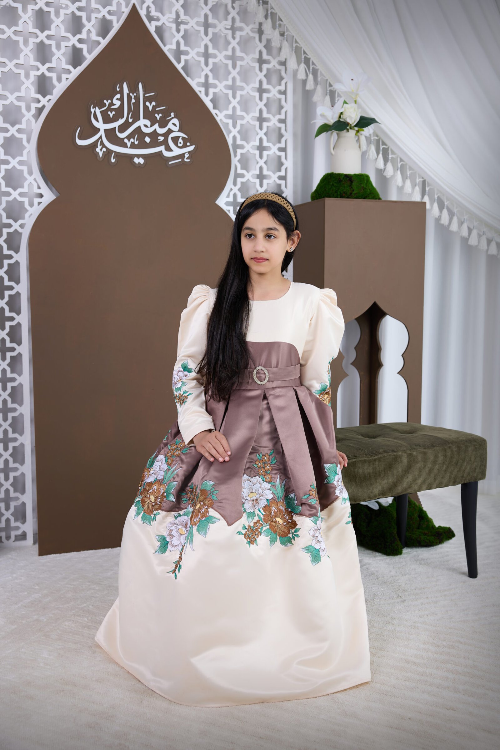 فستان بناتي فاخر مصنوع من قماش التول الناعم، مطرّز بورود أنيقة ومنثور عليه كريستالات لامعة تضفي بريقًا راقيًا. يتميز بتصميم