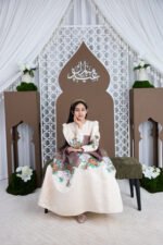 فستان أميري فاخر بتفاصيل استثنائية، يجمع بين نعومة اللون العاجي وفخامة تنورة من قماش التفتا (Taffeta) بلمعته الهادئة وانسداله الأنيق.