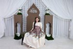 يتميّز الفستان بتطريز ثقيل فاخر بدور كامل يحيط بأسفل التنورة، بنقوش زهرية غنية تضيف عمقًا وفخامة للتصميم.