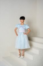 فستان بناتي فاخر مصنوع من قماش التول الناعم، مطرّز بورود أنيقة ومنثور عليه كريستالات لامعة تضفي بريقًا راقيًا. يتميز بتصميم