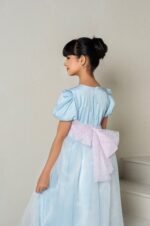 ويكتمل التصميم بحزام رقيق من التول باللون الزهري يزين الخصر ويضفي لمسة أنثوية حالمة.
